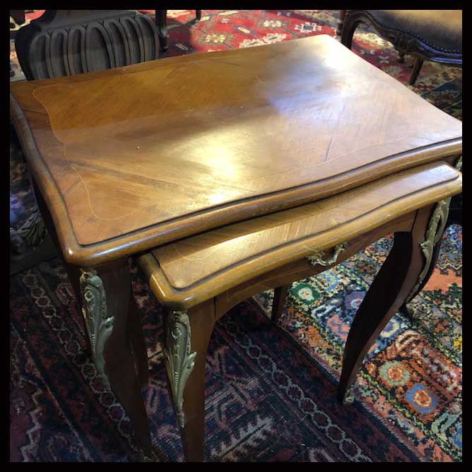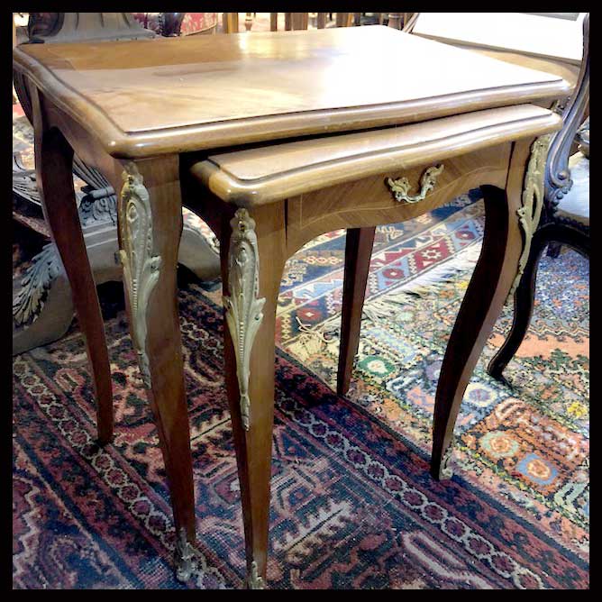 Las mesas nido surgen de la necesidad de utilizar provechosamente los espacios. Estas son un par de mesas nido de madera con terminaciones de bronce.