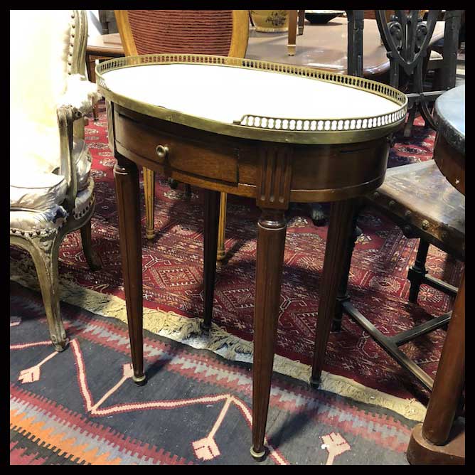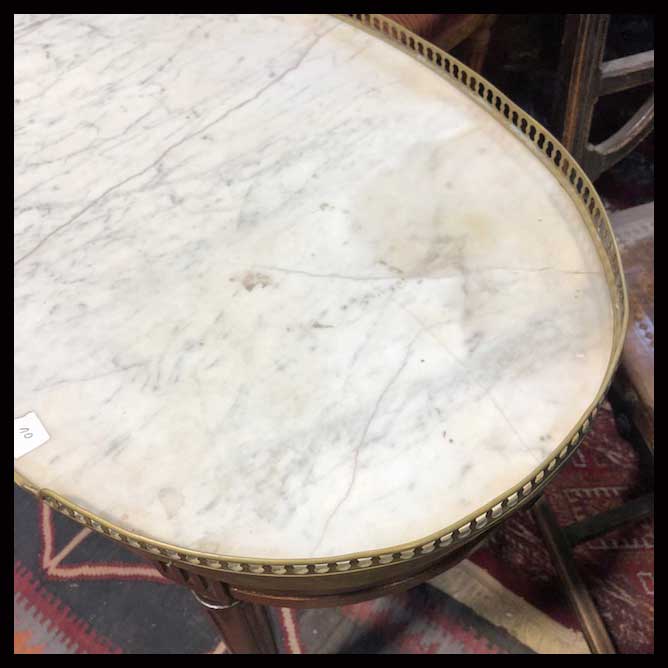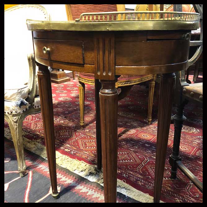 La mesa es un mueble surgido de la ancestral necesidad del hombre de sostener objetos a una altura cómoda para su uso. Su origen se remonta a la época de las cavernas y es uno de los muebles que mayor diversificación ha tenido a lo largo de los años. Recién a comienzos del siglo XX, se empiezan a desarrollar principalmente en Francia, mesas más ligeras, tipo mesas auxiliares que brindan mayor versatilidad a los espacios.Mesita lateral ovalada de madera con cubierta de mármol y borde de bronce.