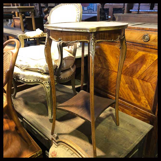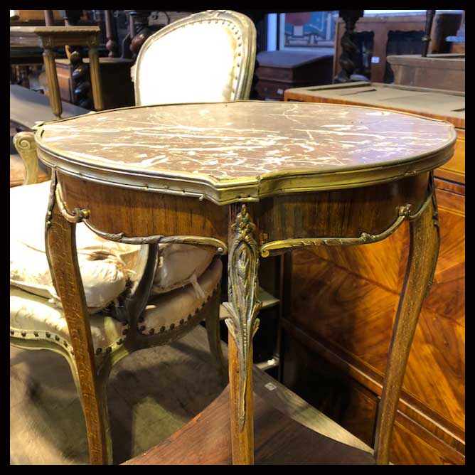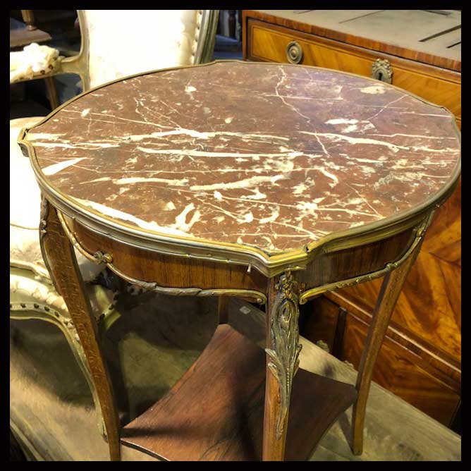 La mesa es un mueble surgido de la ancestral necesidad del hombre de sostener objetos a una altura cómoda para su uso. Su origen se remonta a la época de las cavernas y es uno de los muebles que mayor diversificación ha tenido a lo largo de los años. Recién a comienzos del siglo XX, se empiezan a desarrollar principalmente en Francia, mesas más ligeras, tipo mesas auxiliares que brindan mayor versatilidad a los espacios.Mesa lateral con cubierta de mármol rojizo y terminaciones de bronce.