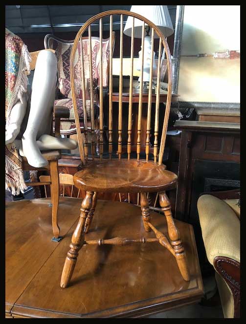 Las sillas Windsor son aquellas en que el respaldo y las patas de madera torneada se insertan por separado en el asiento de madera. En contraposición a las sillas tradicionales, en que las patas traseras son continuación de la estructura del respaldo.Aunque el origen de este diseño se remonta al siglo XVI, se popularizaron en América durante el siglo XVIII. Se presume que su nombre deriva de la ciudad de Windsor, centro de comercio entre fabricantes y vendedores de mobiliario. Su nombre hoy define más un estilo que un lugar de procedencia.Esta es una preciosa silla Windsor de madera.