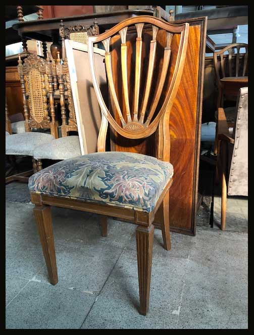 Juego de ocho sillas de madera con su tapiz original. Tienen un respaldo con listones de madera dispuestos de manera curva formando una figura particular.