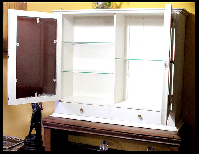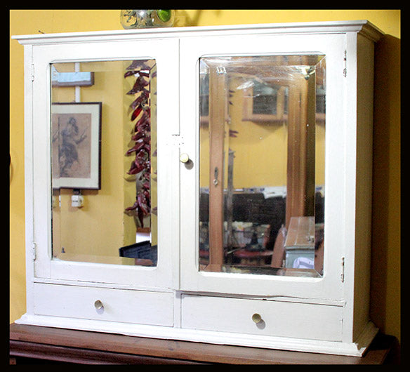 Posee dos puertas con espejos biselados que al interior tienen repisas de vidrio y dos cajones. TI.134 BOTIQUÍN BLANCOEVendido$Vendido