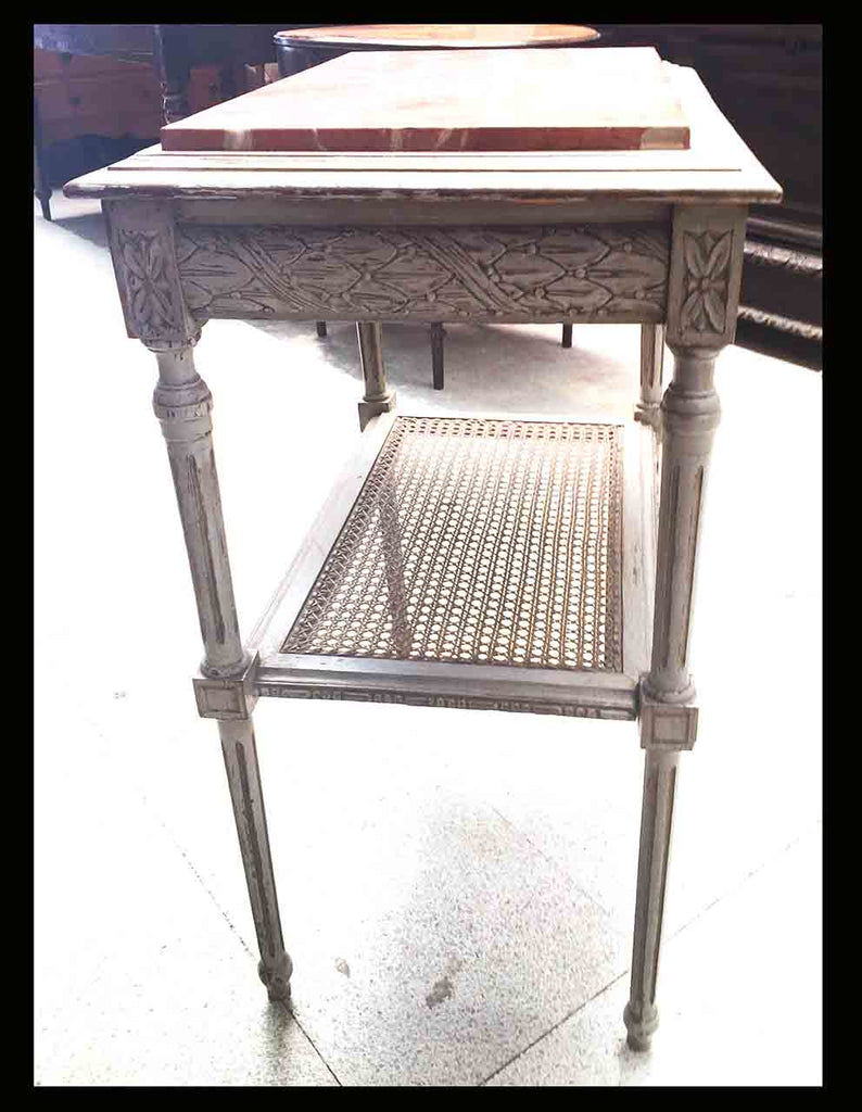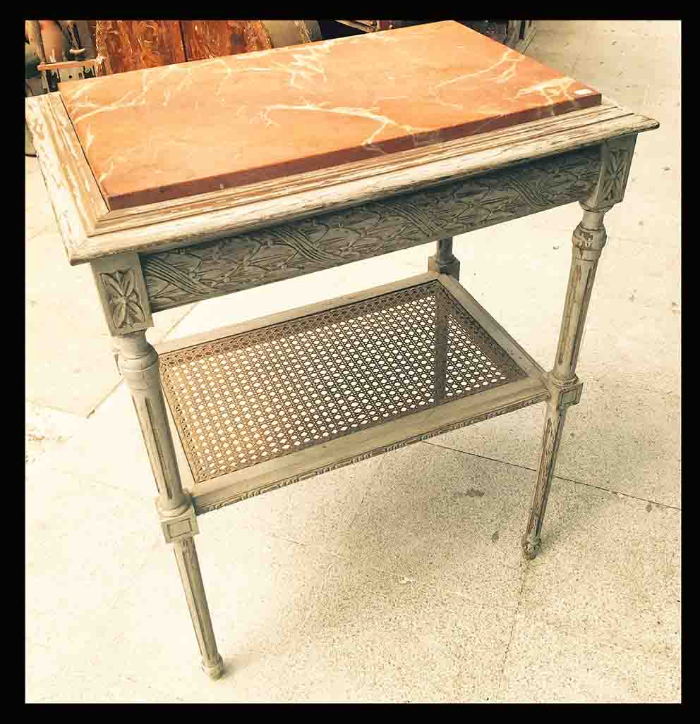 Esta particular pieza, destaca por su delicado tallado, la gran presencia del mármol rojizo y el junco en perfectas condiciones. Sus patas rectas y estriadas nos hablan de un estilo neoclásico tipo Luis XVI.TI.139 MESA FRANCESA LATERALEVendida$VendidaREFERENCIA 1