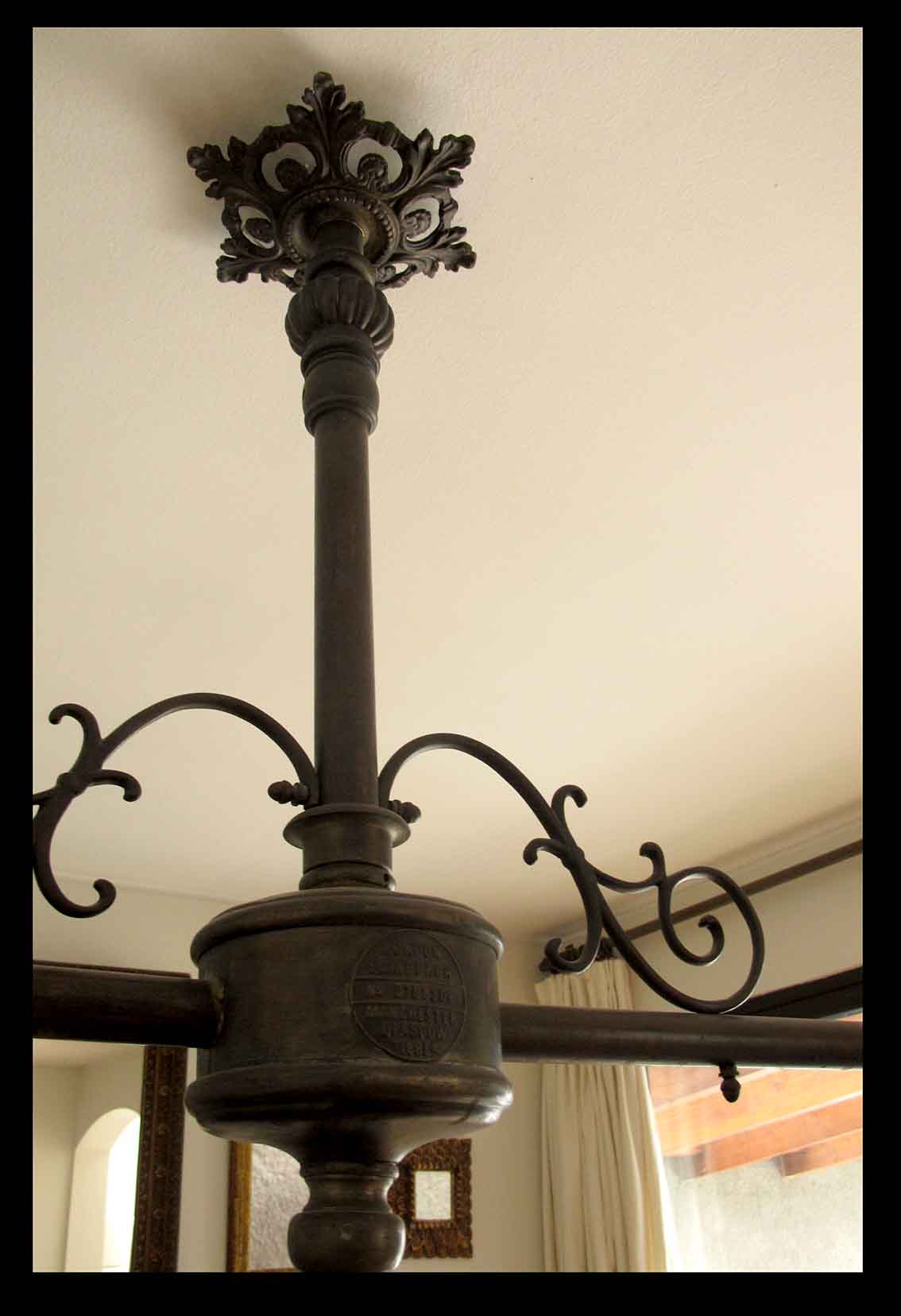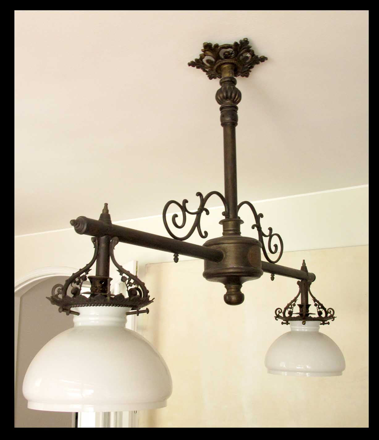 Gran lámpara de fierro fundido y forjado y pantallas blancas de opalina. Su uso original era en una mesa de pool de la época de las salitreras. Fue fabricada en Europa y tiene ya casi un siglo de vida.Es un elemento especial que puede usarse sobre mesas de juego o comedor.Medidas: 123 cm de ancho // 25 cm de profundidad // 93 cm de altoTI.190 LÁMPARA DE MESA DE POOLEDisponible$Consultar precio