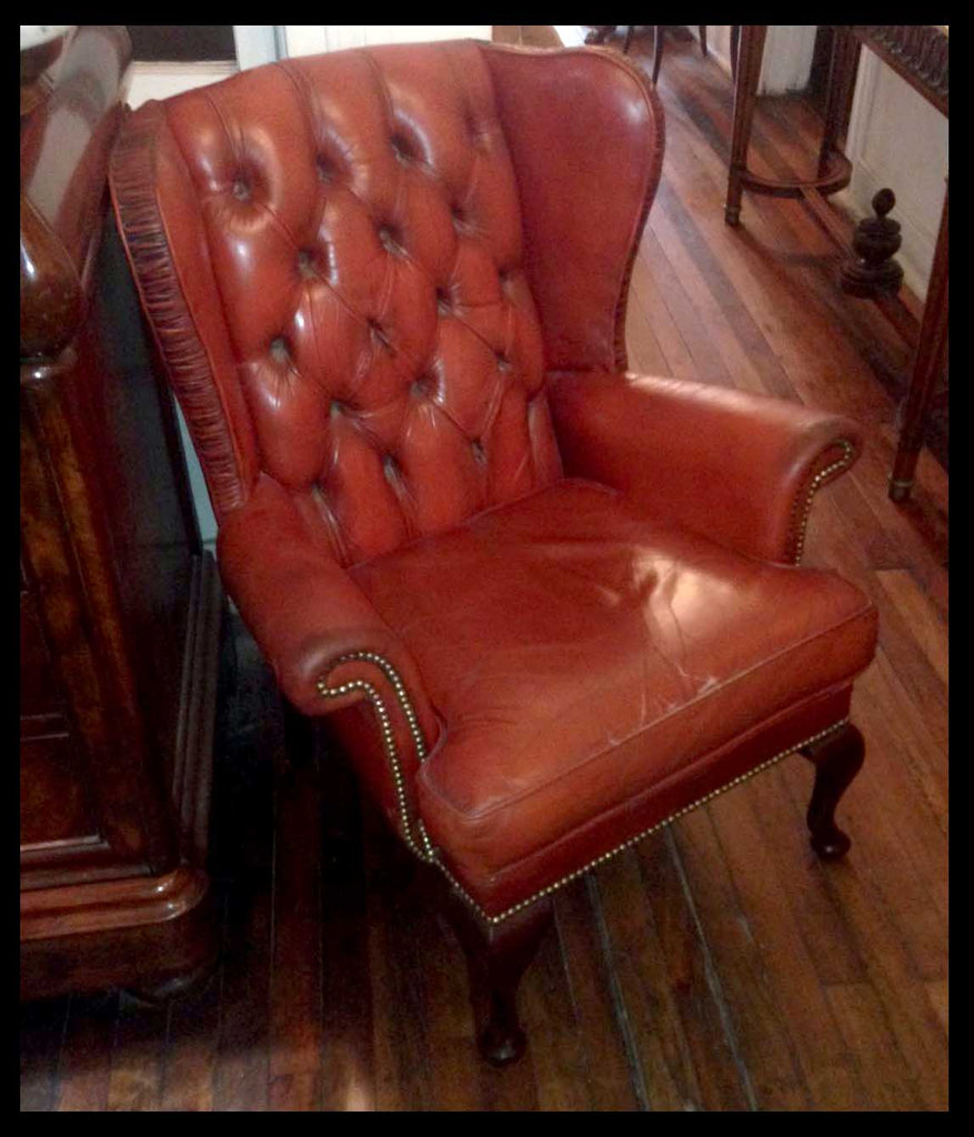 Sitial de cuero capitoné rojo con tachas originales. Tiene patas de madera cabriolé.Lo más parecido al sitial de Matrix. La pieza de Matrix es bastante única por el tallado de leones en los apoya brazos y la particular altura del respaldo. Probablemente este es el ejemplar más parecido que hay en Chile al original de la Morpheus Chair de la película.