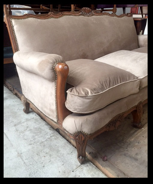 Sofá de madera tallada en estilo provenzal francés con patas cabriolé. Destacan la madera curva y robusta de los apoya brazos y el delicado trabajo de tapiz con tachas de bronce. El tapiz es nuevo: felpa color beige grisáceo.190 cm de largoTI.246 SOFÁ PROVENZAL TRES CUERPOSEVendido$Vendido