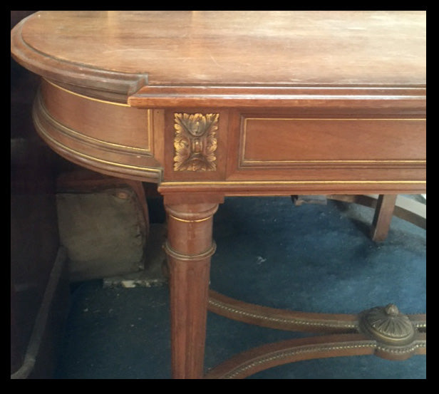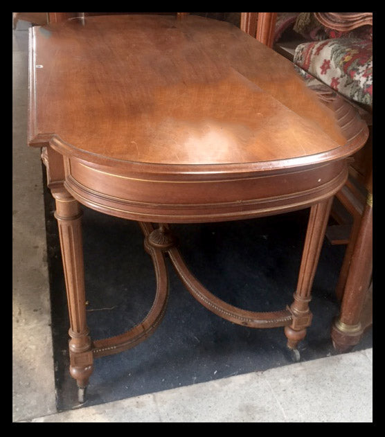 Mesa lateral de madera curva, patas torneadas y estriadas y terminaciones en bronce. Posee ruedas para su fácil traslado.131 cm de largo // 72 cm de ancho // 76 cm de alto