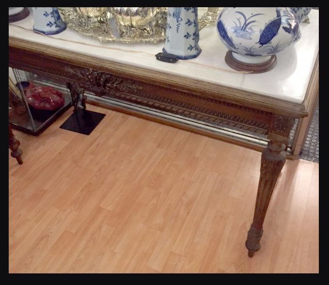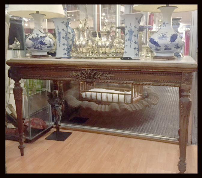 Mesa francesa original de época con originales y especiales tallados. Su cubierta es de mármol original en color blanco perla. Tiene dos cortes en el mármol, pero vale la pena conservar el original. Data de 1870 y sus medidas son de 65 cm x 130 cm.