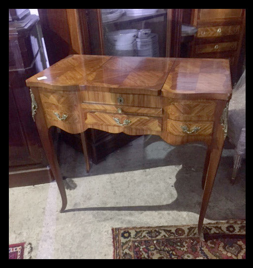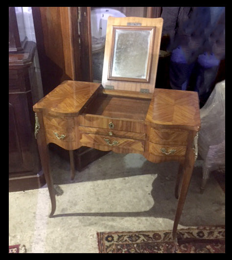Este mueble denominado “Coiffeur” en francés, era empleado en las habitaciones como mueble de tocador. Posee en la cubierta tres tapas abatibles que lo transforman en una mesa llena de compartimentos donde originalmente se guardaban todos los elementos y accesorios de belleza.El tocador es uno de los muebles que mejor refleja los cambios sociales. Los primeros tocadores fueron desarrollados en el Antiguo Egipto y consistían en unas cajas en donde se almacenaba todo lo necesario para un ritual de belleza. Fue en la Europa del sXVIII donde logró mayor esplendor y variedades.Con el uso del jabón y los avances médicos en torno a la higiene, el tocador dejó a ser habitual en las habitaciones y se trasladó a los baños.Esta pieza de estilo Luis XV, que destaca por su fina marquetería, tiradores de bronce y espejo original, puede usarse como mesa de arrimo o velador o tocador.