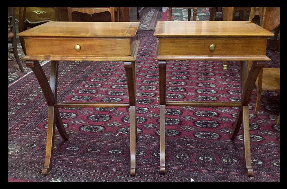Par de veladores bajos con patas en forma de cruz y tiradores de bronce. Posible uso como mesas laterales de escritorio.