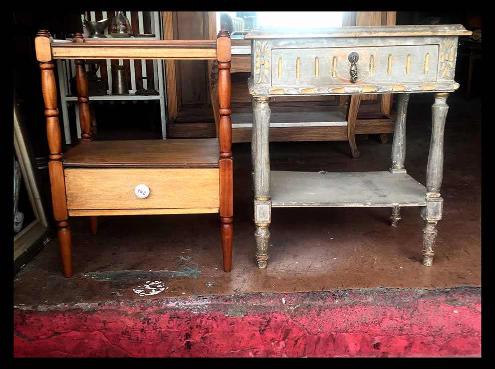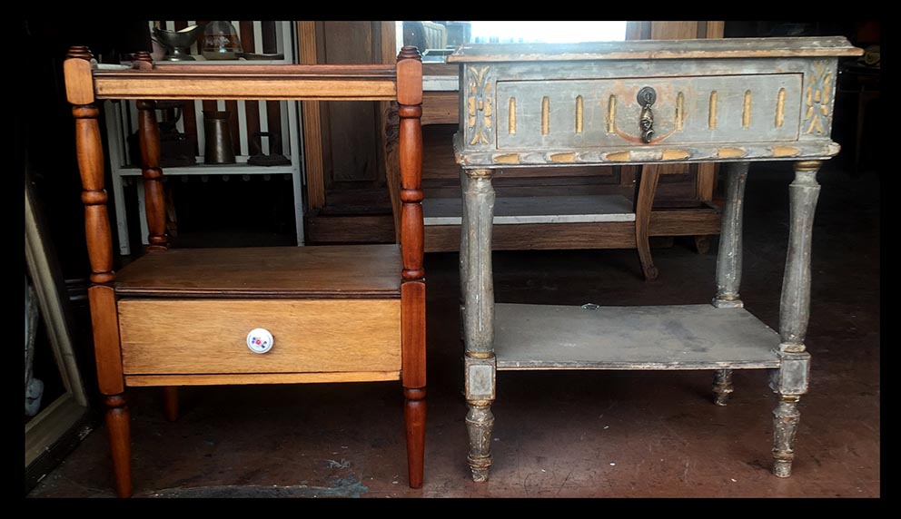 Veladores rústicos de distintos formatos, todos en madera, por reparar.