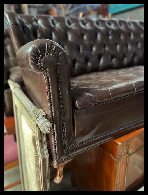 Este es un sofá de tres cuerpos capitoné, tapizado con cuero café.
