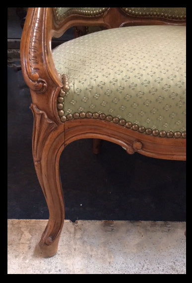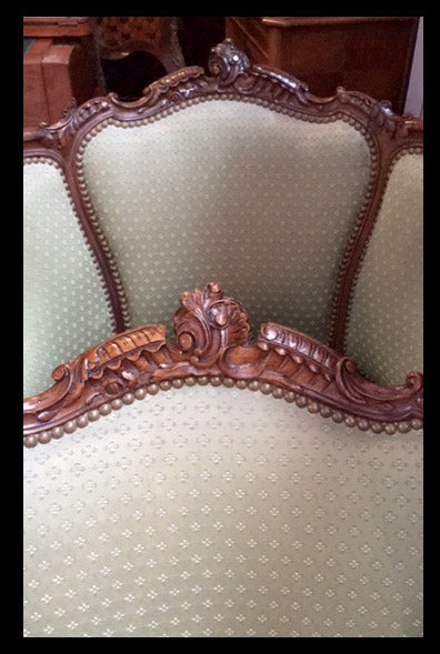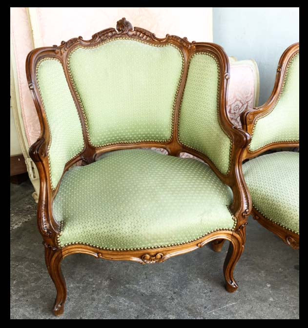 Las sillas son piezas fundamentales del comedor, pero las de estilo clásico, gracias a su atractiva apariencia, habitan cualquier parte de la casa. Sus formas redondeadas y materiales trabajados las convierten en un elemento decorativo más allá de su uso.Los franceses inventaron las sillas con apoyabrazos, como muchos otros diseños populares de mobiliario.Estos son un par de sitiales franceses de madera tallada, con tapiz verde con tachas de bronce y patas cabriolé.