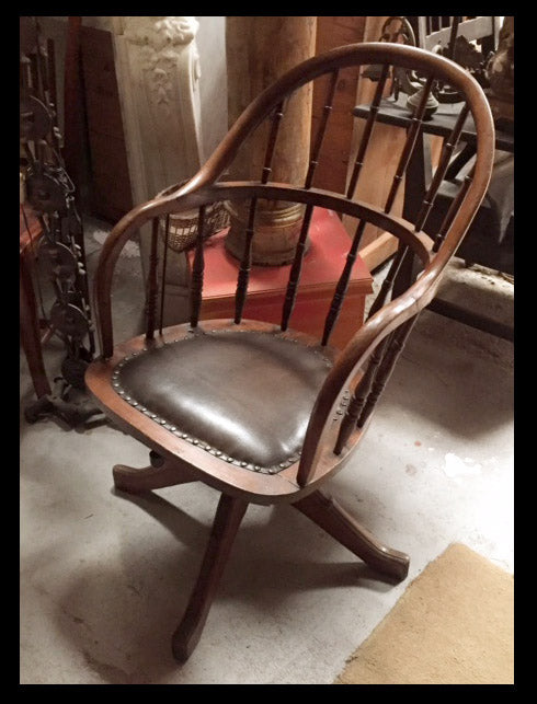 Inicialmente una silla en una vivienda no solo era un objeto en el cual uno se sentaba, sino que era un elemento de elegancia, dignidad y solvente economía.Este mueble era utilizado especialmente por la realeza o la gente con poder económico, por esa razón muchos de los nombres de los diferentes modelos actuales datan de siglos pasados, ya que los diseñadores de éstas, mostraban respeto a los reyes colocándole el nombre a las sillas como el caso de la silla victoriana o silla reina.Esta es una silla giratoria de escritorio de madera y cuero café, con tachas de bronce.