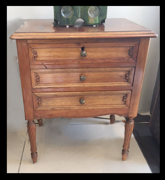 En sus orígenes, el velador era la mesa para posar las velas que iluminaban las estancias. Eran mesas de pequeño tamaño y un solo pie. Con el tiempo, el velador fue evolucionando y transformándose en una pieza funcional y de diseño en las habitaciones.Antiguamente no eran comunes las camas de dos plazas, normalmente en las habitaciones habían dos camas con un velador central. Por tal motivo, es difícil encontrar dos veladores antiguos iguales.Este es un par de veladores ingleses de roble, tallados, de 3 cajones y con patas torneadas en forma retorcida.Sus dimensiones son 52 cm de largo, 36 cm de profundidad y 61 cm de altura.