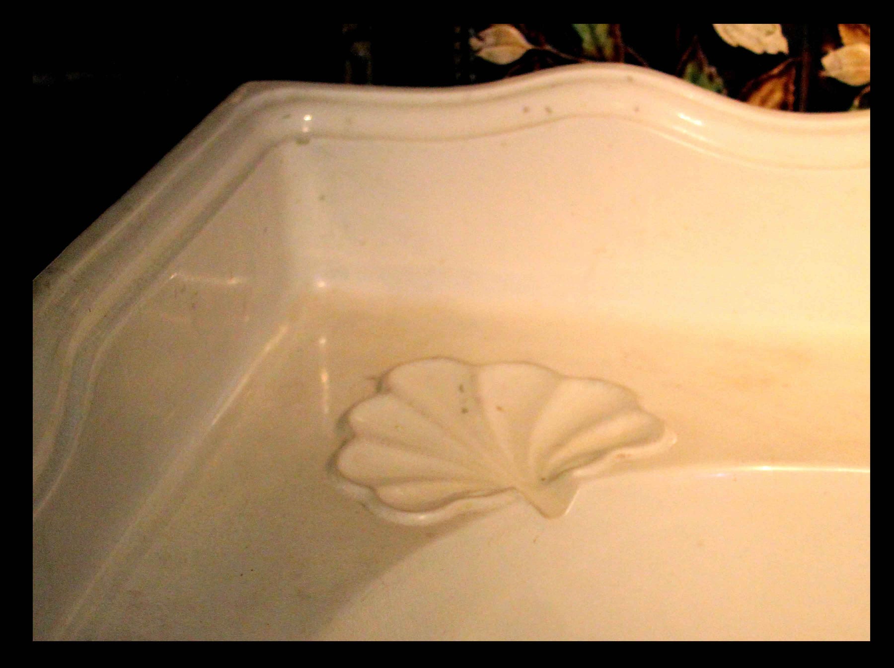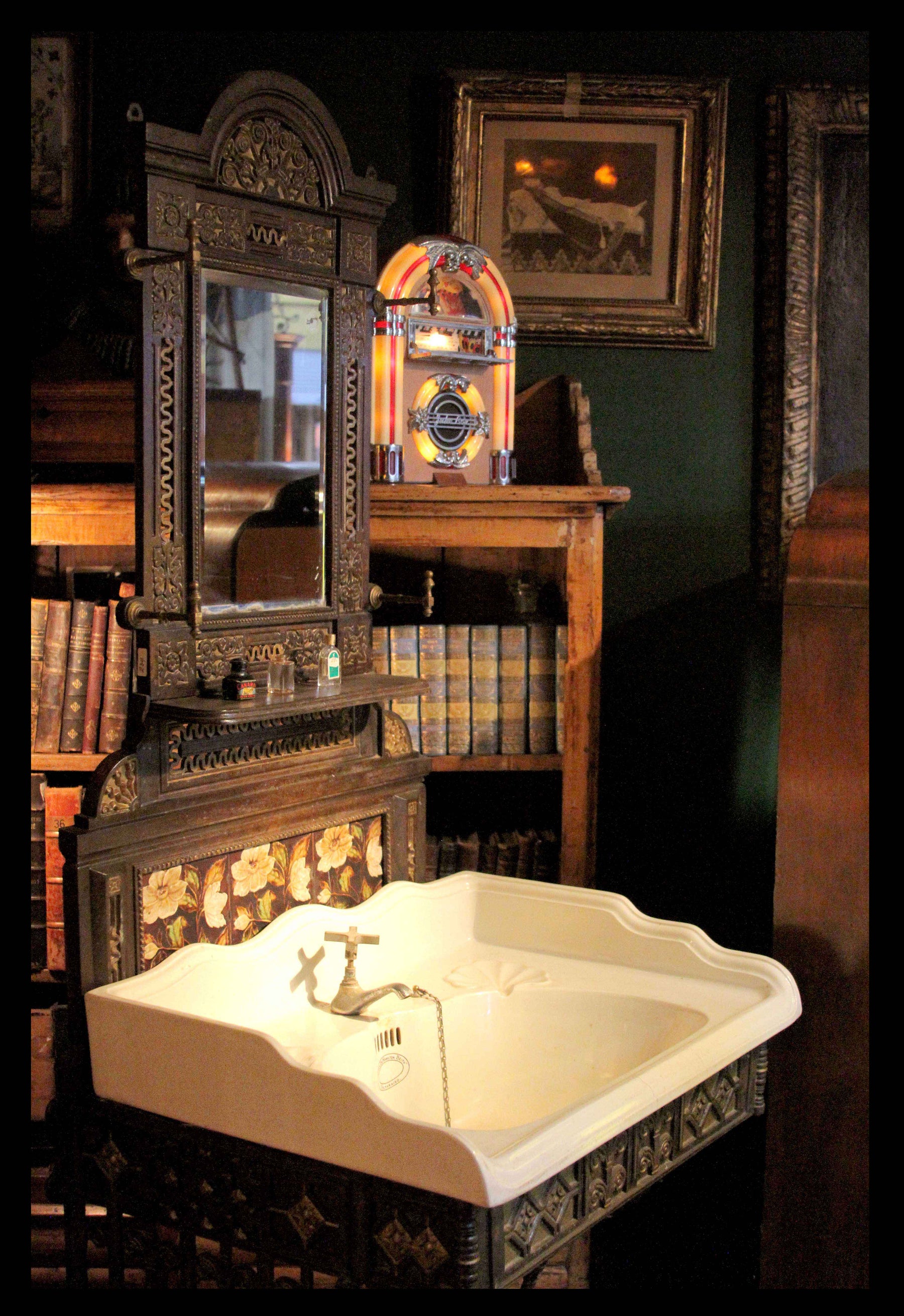 Vanitorio de loza antiguo con jaboneras talladas y llave original. Tiene sello de Valparaíso y según los apellidos que registra “Hamilton Beith” posiblemente se refiere a unos inmigrantes escoceses que vivieron en el puerto a fines del siglo XIX. El mueble es de otra procedencia, pero se venden en conjunto.