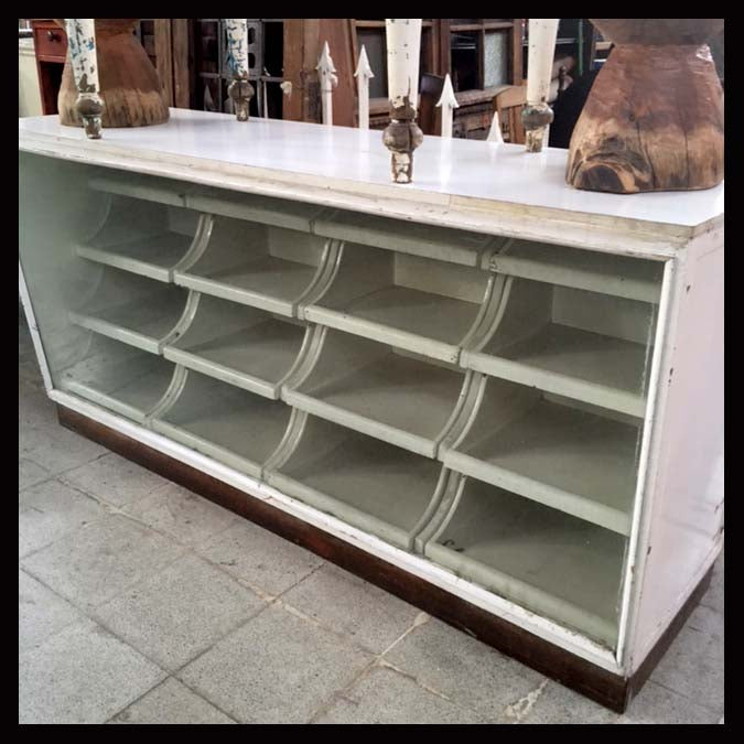 Estos son un par de muebles de almacén tipo vitrina con 12 cajones de madera cada uno.Hoy funcionan bien en cocinas, sobretodo considerando que cada vez las cocinas son más abiertas a los comedores y livings, por lo que vale la pena pensar en un mobiliario utilitario, pero que además sea bello y con historia.Las medidas son 197 x 60 x 96 cm.
