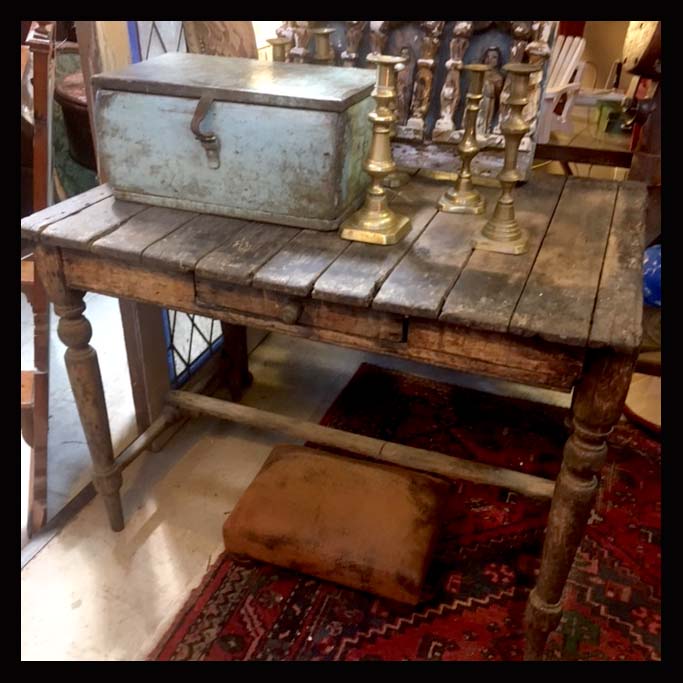 La mesa es un mueble surgido de la ancestral necesidad del hombre de sostener objetos a una altura cómoda para su uso. Su origen se remonta a la época de las cavernas y es uno de los muebles que mayor diversificación ha tenido a lo largo de los años. Recién a comienzos del siglo XX, se empiezan a desarrollar principalmente en Francia, mesas más ligeras, tipo mesas auxiliares que brindan mayor versatilidad a los espacios.Esta es una mesa rústica con un cajón. Sus medidas son 90 x 60 x 66 cm.