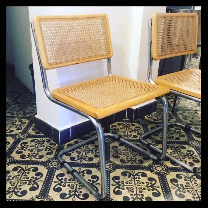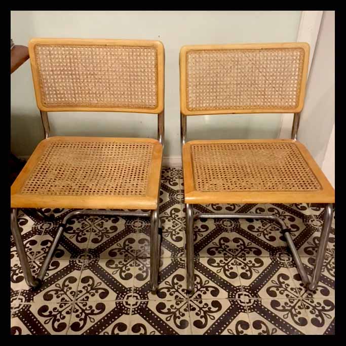 Estas son un par de sillas cantilever. En los años 20’ Mart Stam comenzó a experimentar con tuberías dando origen a las primeras sillas en voladizo de la historia.Estas sillas aguantan todo el peso en las patas anteriores y su prolongación horizontal.Este par, en particular, es de acero, madera y junco.