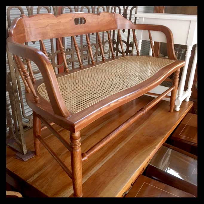 La caña o junco es el término que se usa para la piel externa del tallo de una planta de la familia de las palmeras, nativa de Asia y África. Los primeros muebles con enjuncado aparecieron en 1660 en Holanda, Francia e Inglaterra, luego del intercambio con Asia. Su uso inicial más común era para el asiento y respaldo de sillas de madera. Fue desde siempre un material muy valorado por ser ligero, duradero y fácil de mantener limpio de gusanos y polillas. Ya en el siglo XIX, los muebles enjuncados se asociaban más a Inglaterra y Alemania que tenían colonias en lugares como Indonesia e India. La mayor popularidad fue lograda con Thonet a mediados del siglo XIX a través de la silla Nº14 que repletó todas las cafeterías.Esta es una banca de junco y madera, que mide 120 x 55 cm.