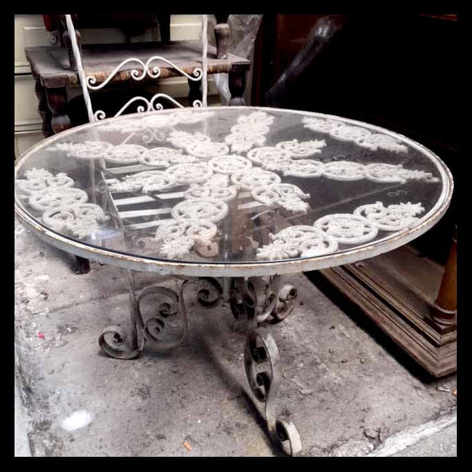 Desde el siglo XIX, comenzó a trabajarse con especial dedicación en mobiliario y artefactos de fierro forjado para decorar los jardines de las estancias. Todas estas piezas destacan por la curvatura y delicadeza de su forma y decorados. Tienen además la característica de enfrentar de mejor manera la corrosión de la intemperie.La dificultad de soldar tales piezas de fierro curvado ha hecho que se utilice principalmente para muebles y objetos decorativos.Esta es una mesa de fierro fundido y vidrio.