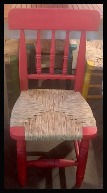 Estas cuatro sillas son de madera pintada roja con asiento de paja. No tienen apoyabrazos y su respaldo tiene listones de madera torneados, similares a las patas.