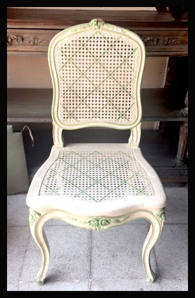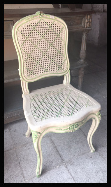 Sillas francesas de madera tallada con motivos florales, pintada con una pátina color crudo con terminaciones verdes. Tanto el respaldo como el asiento están hechos con junco. No tienen apoyabrazos.