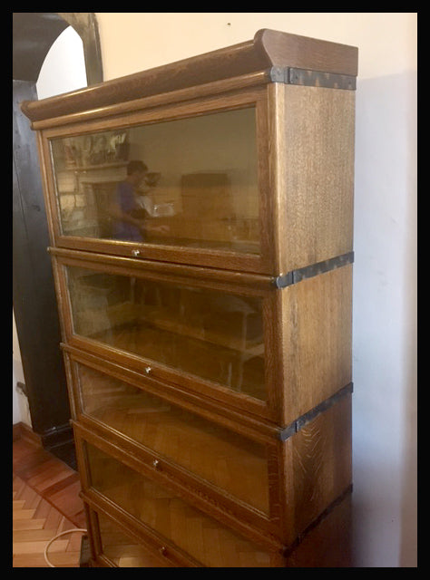 Repisero de madera. Tiene 5 repisas, todas cubiertas por puertas de vidrio que se abren hacia arriba.