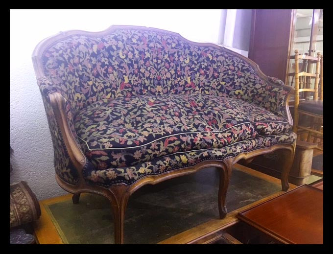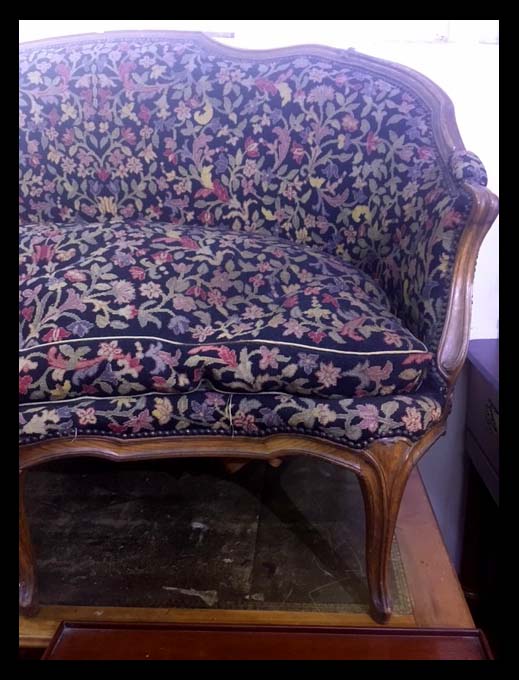 Este es un juego de un sofá, dos sitiales y dos sillas tapizadas con este tipo de tejido con fondo negro y motivos florales en distintos colores.