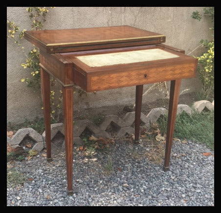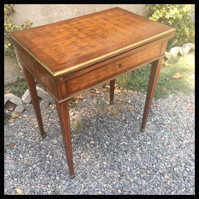 Curioso mueble multifuncional. Cerrado se ve como una mesa rectangular, que sirve de arrimo, con cajonera y marquetería geométrica en la parte superior y los costados.