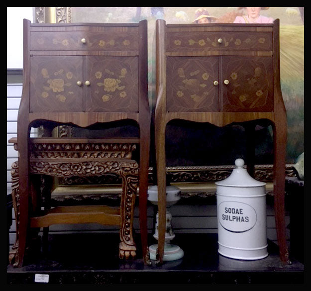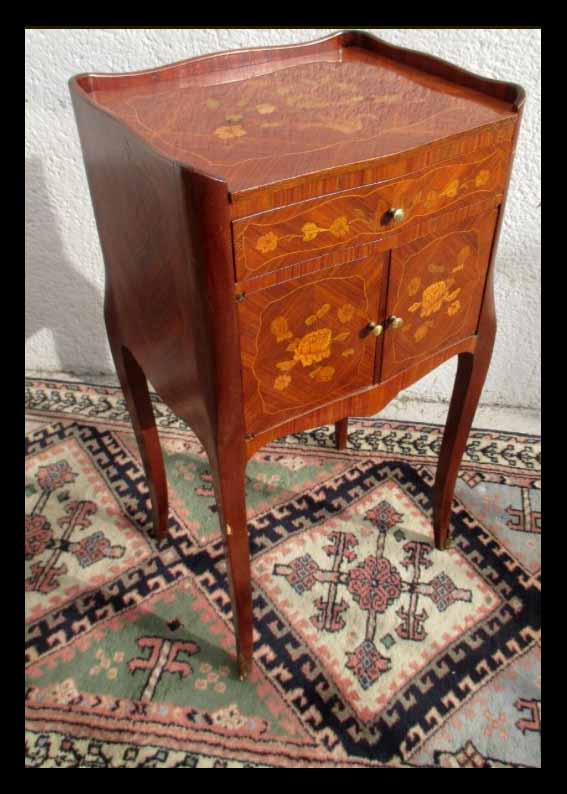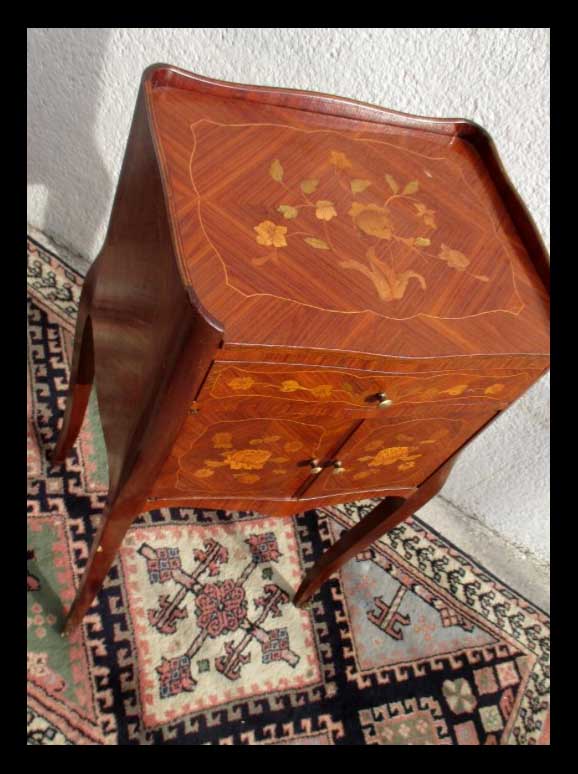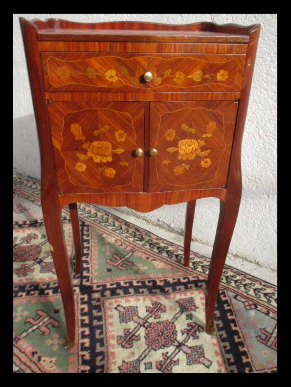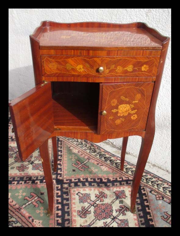 En sus orígenes, el velador era la mesa para posar las velas que iluminaban las estancias. Eran mesas de pequeño tamaño y un solo pie. Con el tiempo, el velador fue evolucionando y transformándose en una pieza funcional y de diseño en las habitaciones. Este par de veladores tienen un cajón y bajo él dos puertas. Tiene marquetería con motivos florales y terminaciones de bronce tanto en las puertas y el cajón, como en la parte inferior de sus patas. Lo más común es encontrar veladores antiguos únicos y no de a pares, sin embargo, estos son dos veladores iguales.