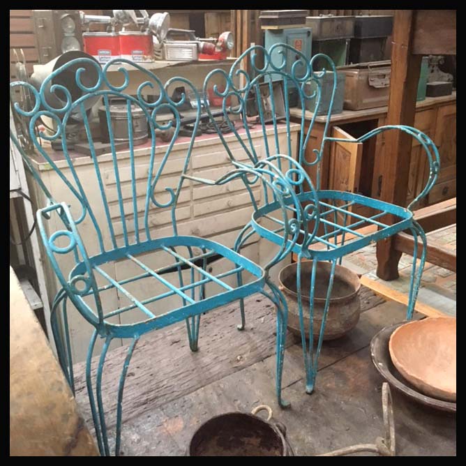 Este es un par de sillas de fierro forjado color turquesa para niños. Tienen apoyabrazos y patas con terminaciones curvas, y un respaldo con curvaturas muy detalladas.