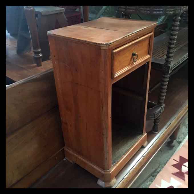 En sus orígenes, el velador era la mesa para posar las velas que iluminaban las estancias. Eran mesas de pequeño tamaño y un solo pie. Con el tiempo, el velador fue evolucionando y transformándose en una pieza funcional y de diseño en las habitaciones. Este es un velador único de madera rústica. Tiene un compartimiento inferior al descubierto, un cajón con tirador de bronce en la parte superior y una cubierta de madera. Se entrega restaurado, con el interior pintado y cubierta negra.