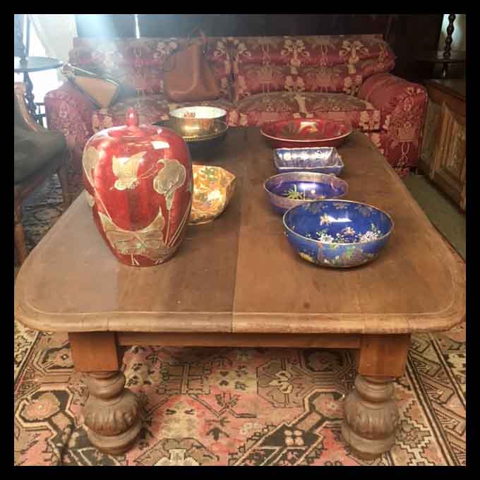 Mesa de centro rústica de madera de lingue. Originalmente era una mesa de mayor altura cuyas patas fueron cortadas. Tiene patas torneadas y de madera tallada que son originales.