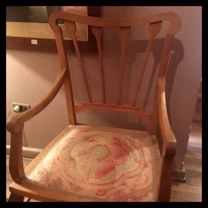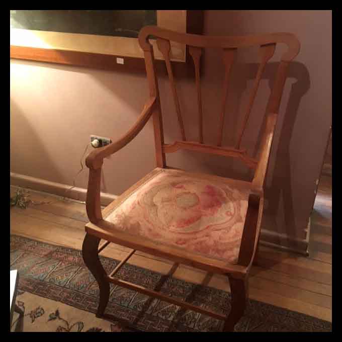 Sitial inglés de madera. Tiene patas y apoyabrazos curvos, y el respaldo está hecho con listones de madera con forma de remo.
