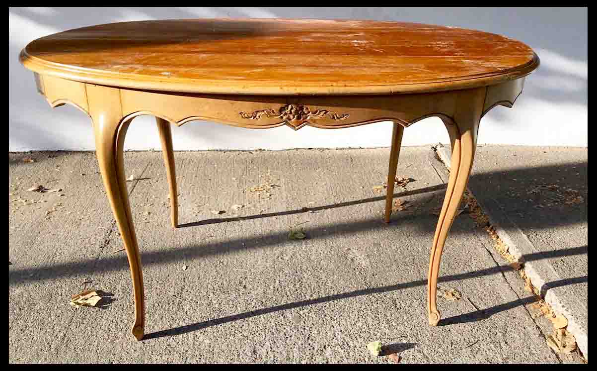 Mesa ovalada de madera de encina. Tiene un tallado floral por los lados y patas curvas.