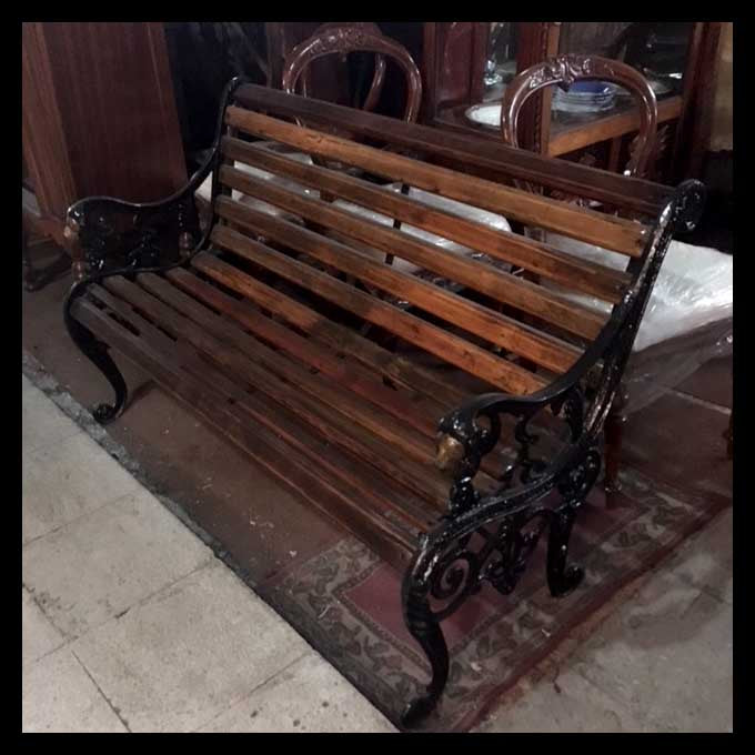 Esta es una típica banca de plaza de fierro negro y tablas de madera dispuestas en forma curva en el asiento y respaldo.Mide 128 // 57 cm.