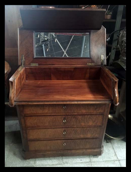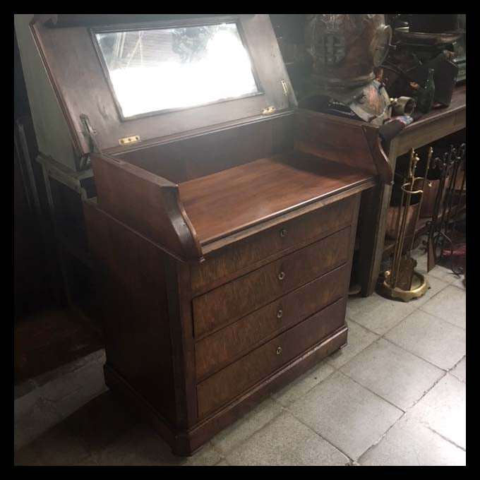 Escritorio enchapado en madera de nogal. Cerrado puede servir como arrimo y tiene una tapa abatible que al levantarse deja al descubierto una superficie de escritorio y un espejo en frente.
