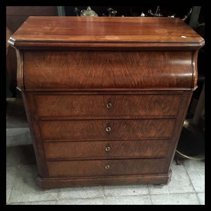 Tiene bisagras de bronce y cuatro cajones con cerradura. Tiene rueditas para transportarlo.Medidas cerrado: 91 // 45,5 // 99 cm.