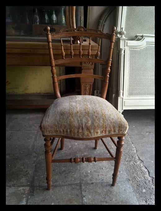 Sillas de comedor con tapiz de distintos formatos. La primera es de madera tallada con pátina envejecida y tiene un tapiz rojo en el asiento y el respaldo. Otra es de madera tallada con pátina blanca y patas cabriolé, tiene un tapiz celeste con blanco solo en el asiento. La tercera es de madera torneada en las patas y el respaldo y tiene un tapiz con amarillo en el asiento.