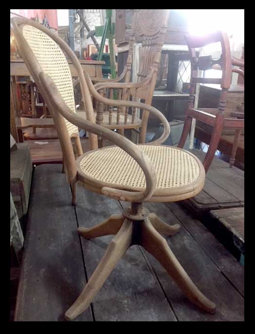 Michael Thonet fue un diseñador de muebles y carpintero alemán. Con sus diseños, busca simplificar el costoso uso de cincel y la elevada cantidad de ensambles necesarios para construir muebles. Patentó su proceso para el doblado en caliente de madera. En su época, la madera curva sólo se empleaba en la construcción de barcos usando calor y agua. Thonet perfeccionó durante años su curvado de maderas mediante vapor. Su obra consagró la técnica del enjuncado durante el siglo XIX. Silla Thonet giratoria de escritorio de madera de haya y junco.