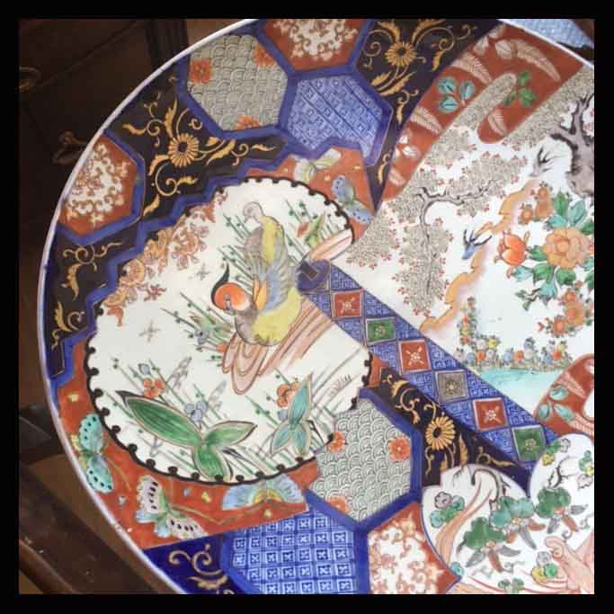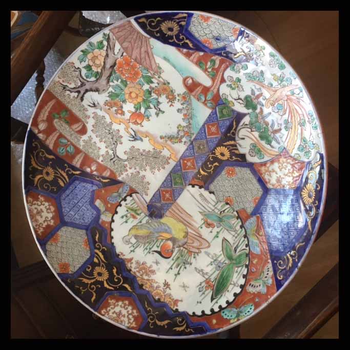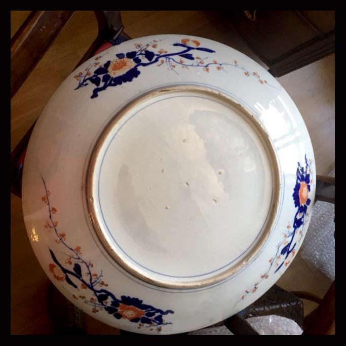 Gran plato Imarí de 60 cm de diámetro.La porcelana de Imari, es el nombre occidental que se le ha dado a los productos hechos en Arita, Japón. El nombre se debe a que estos se exportaban desde Imarí. Esta porcelana, fue la primera desarrollada en Japón y se popularizó en Occidente a mediados del siglo XVII y sus diseños fueron muy influyentes en la orientalización de la porcelana europea.