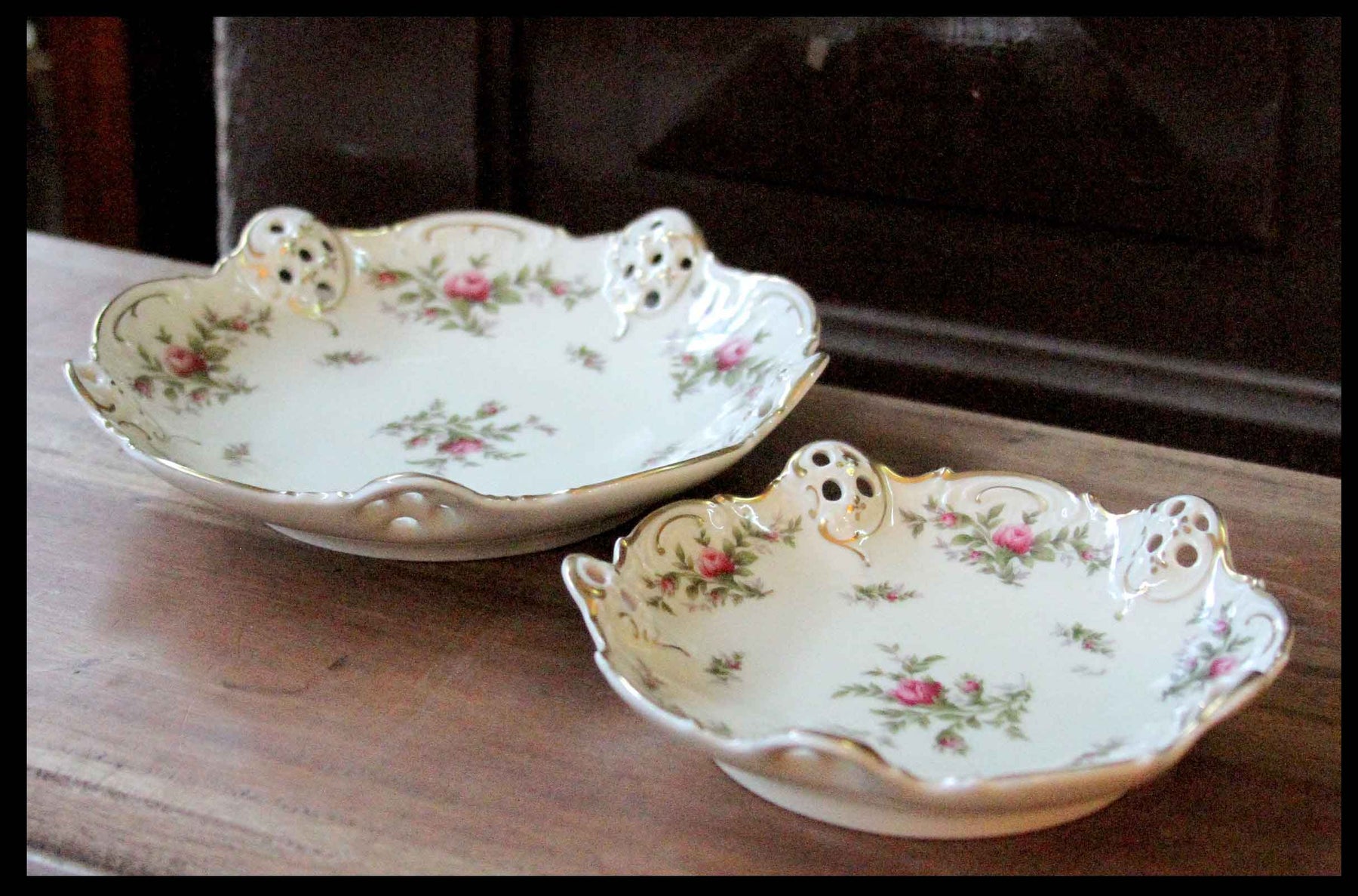 Dos platitos Roshental de igual diseño floral y diferente tamaño. Esta porcelana proveniente de Alemania, data de 1900.