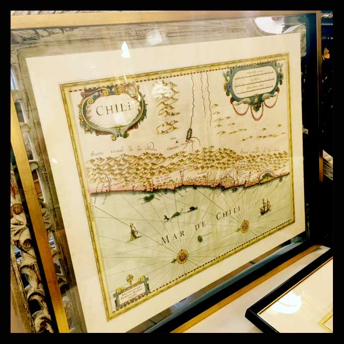 Este es un mapa ilustrado de Chile original de 1936 hecho en Holanda con reseña histórica en la parte de atrás.Tiene un enmarcado especial en vidrio por ambos lados.Mide 65 x 55 cm.