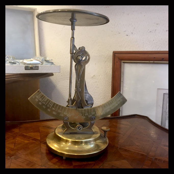 La historia de las pesas y balanzas está estrechamente vinculada al comercio. Los egipcios la inventaron, por la necesidad de cuantificar los productos que vendían. Luego, ya entrada la modernidad, cada comercio o almacén contaba con sus propios instrumentos de peso. Durante los primeros años del siglo XX, comenzaron a desarrollarse pesas con diseño, colores y materiales originales, que las transformaron en importantes piezas de decoración y colección.Esta pesa es completa en bronce con aguja hacia abajo y bandeja redonda pequeña.