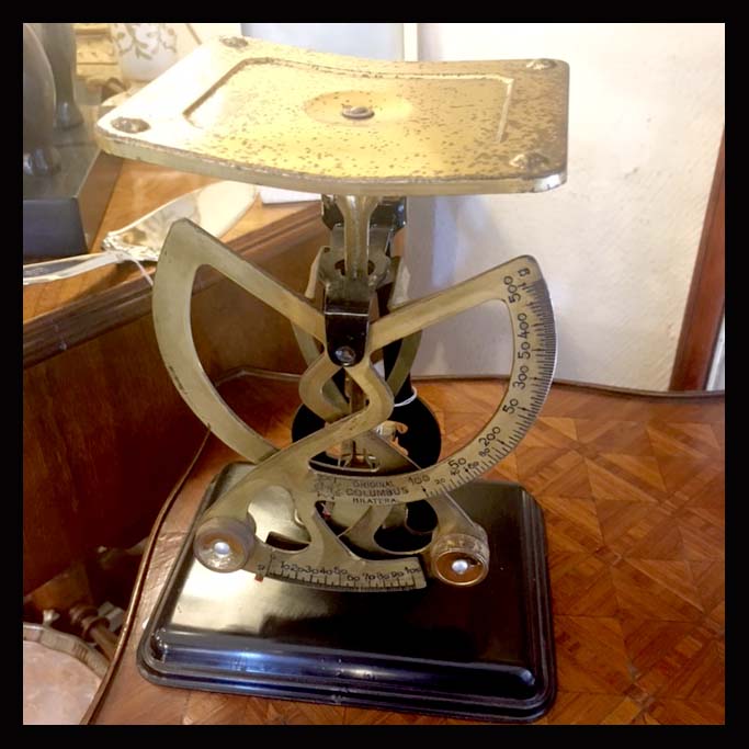 La historia de las pesas y balanzas está estrechamente vinculada al comercio. Los egipcios la inventaron, por la necesidad de cuantificar los productos que vendían. Luego, ya entrada la modernidad, cada comercio o almacén contaba con sus propios instrumentos de peso. Durante los primeros años del siglo XX, comenzaron a desarrollarse pesas con diseño, colores y materiales originales, que las transformaron en importantes piezas de decoración y colección.Esta pesa tiene una base negra de latón y el resto de bronce. Posee una bandeja cuadrada.