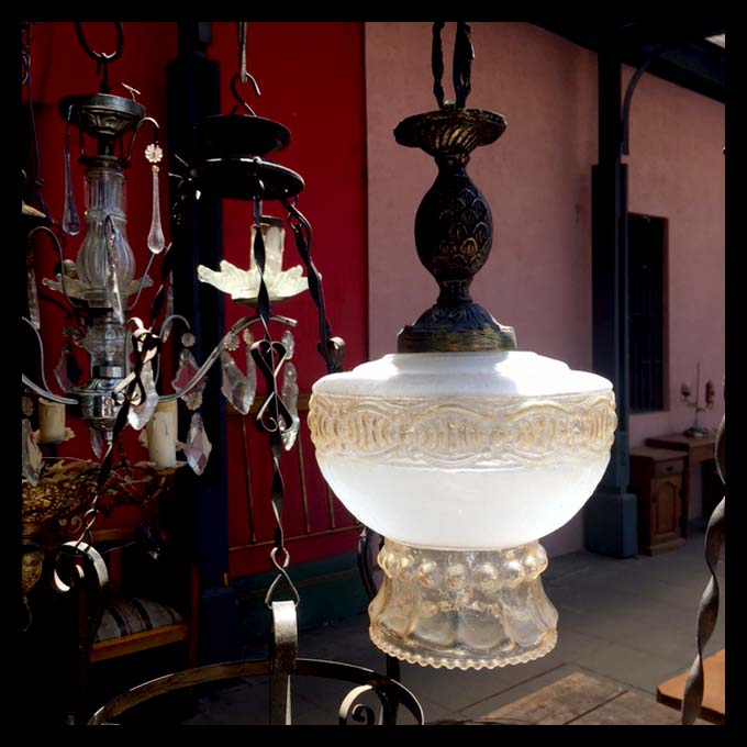 Desde la invención del fuego hasta nuestros días, el hombre ha buscado creativas formas de iluminar los espacios que habita. Al comienzo, eran las antorchas, luego los candiles seguidos de diversas formas de luminarias a petróleo que se activaban con fuego. Con la invención de la luz eléctrica los diseños y posibilidades de las lámparas aumentaron exponencialmente. Cada país y estilo imperante fue creando diversas formas de alumbrar.Esta es una lámpara colgante de vidrio soplado y vidrio empavonado.