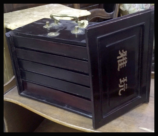 El mahong es un juego de mesa clásico originario de China, que a partir de la década del 20 fue exportado al resto del mundo. El juego está pensado para cuatro jugadores y su objetivo es formar series de naipes, con distintas combinaciones, que busquen sumar la mayor cantidad de puntos posibles. Existen distintas teorías sobre la historia del mahong, pero algunas de las más aceptadas dicen que proviene de la tradición astrológica de China y los antiguos oráculos, o que fue creado por el pensador chino Confucio. Las fichas o naipes se han hecho de distintos materiales a lo largo de la historia, principalmente marfil y madera de bambú. Las versiones más modernas son de plástico. Este es un antiguo juego original de Mahong, viene en una cajonera de madera negra con mango y detalles de bronce en la parte superior. Dentro de los cajones vienen las piezas, en este caso, de madera.