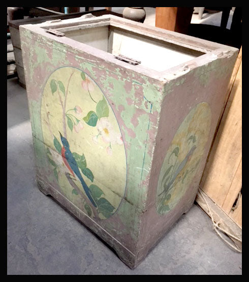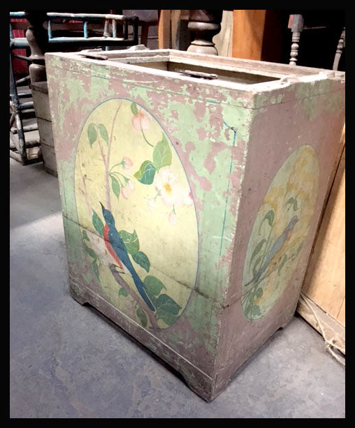 Cajón de madera pintado. Tiene por cada lado el dibujo de un pájaro de colores, sobre ramas con flores. Por su tamaño podría ser usado como paragüero o bastonero, entre otros usos.