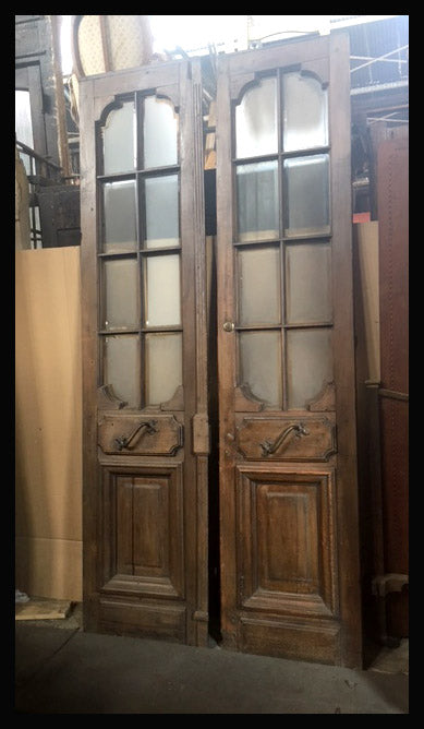 Puertas dobles de madera de lingue. En la parte superior tienen ventanillas de vidrio, y la parte inferior un marco con molduras talladas.